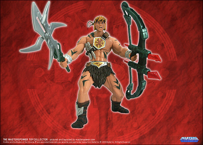Weitere He-Man Variante als Dschungelkämpfer im tarnfarbigen Outfit mit drehbaren Klingenschwert und einem Laserbogen, welcher Geschosse abfeuern kann.